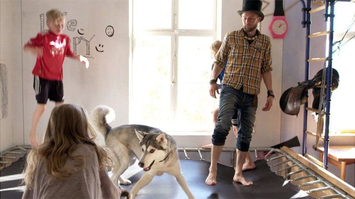 Его дом — бывшая сельская школа. У Юхи шестеро детей. Все они бегают по дому, скачут на батуте, карабкаются по канатам, прыгают сальто с пианино на ковер и ездят по полу на роликовых коньках. Когда в доме становится скучно, семейство выходит на улицу и принимается прыгать по крышам машин, коих в семействе Ярвиненов, невзирая на недавнюю безработицу, четыре.