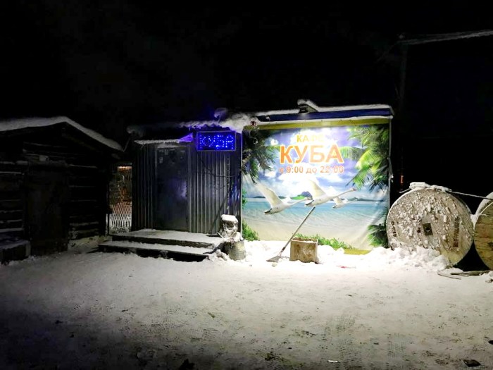 29 декабря. Юмор в Сибири 😀. Когда на улице температура опустилась до минус 50 градусов, мы остановились согреться в кафе «Куба». Осторожно, туалет… снаружи! 🙃 😉